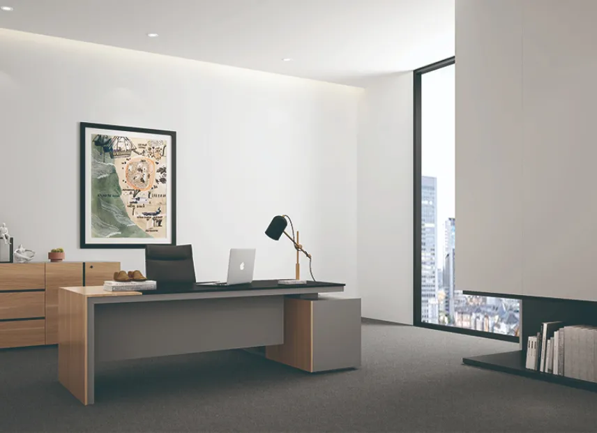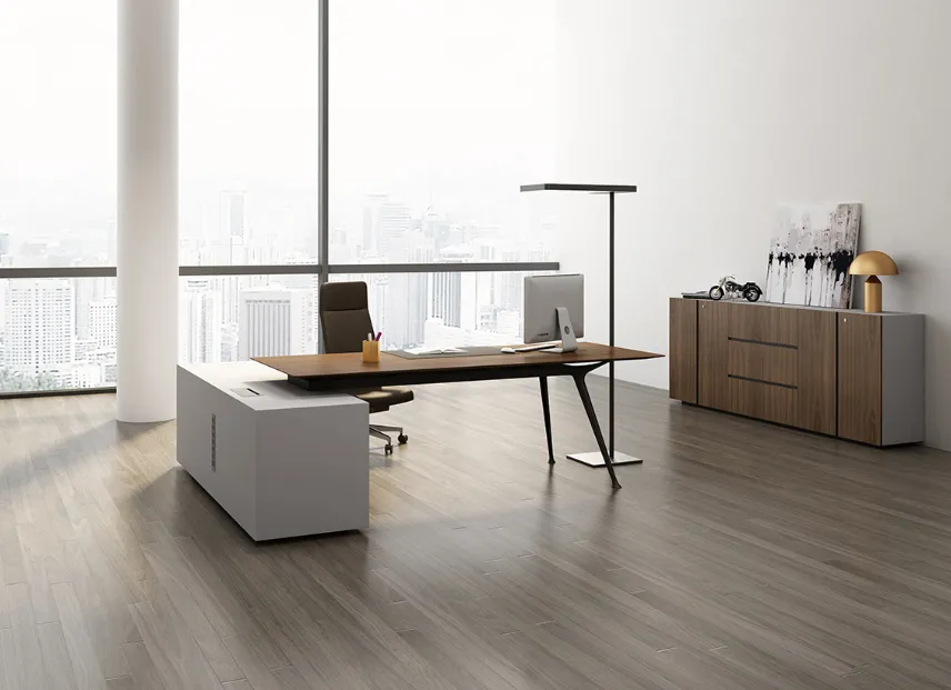 يبرز تصميم سطح المكتب المشطوف الجمال الطبيعي وحبوب الخشب مع صقل رائع. خزانة جانبية متكاملة ذات سعة كبيرة مع أبواب وأدراج منزلقة تلبي احتياجات الإدارة الأكثر تطلبا وتعقيدا.